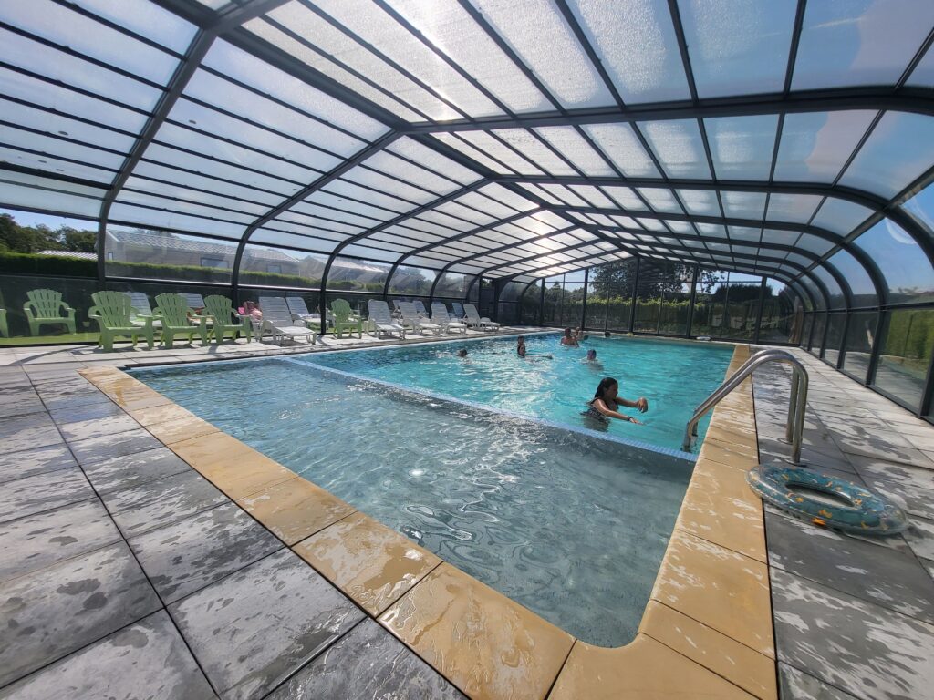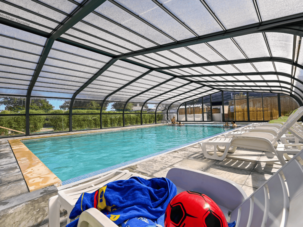 Le camping Ô Rivage 3 étoiles situé dans le Morbihan à Ambon – Muzillac, dispose d’une piscine couverte et chauffée accessible à tous !